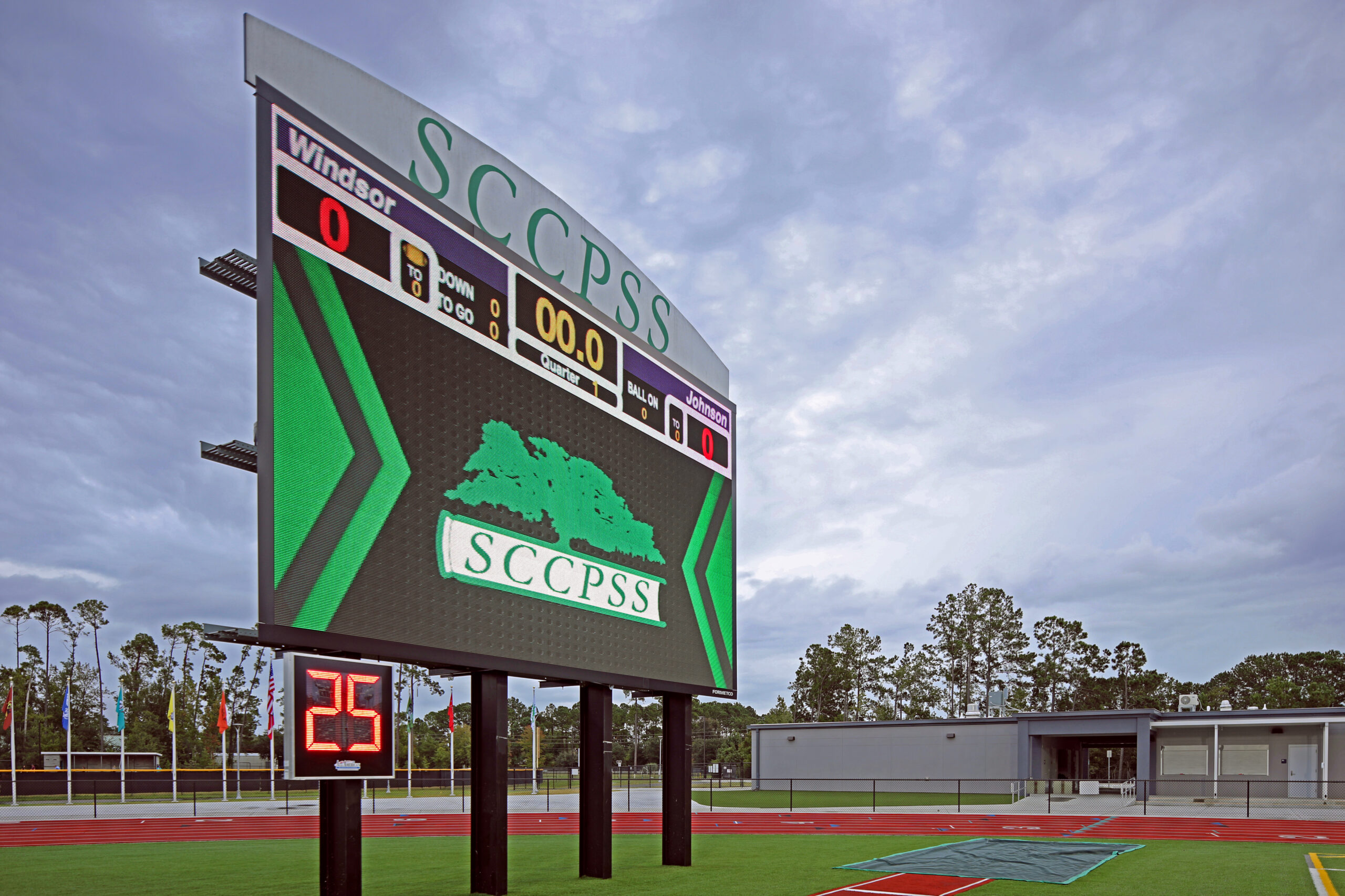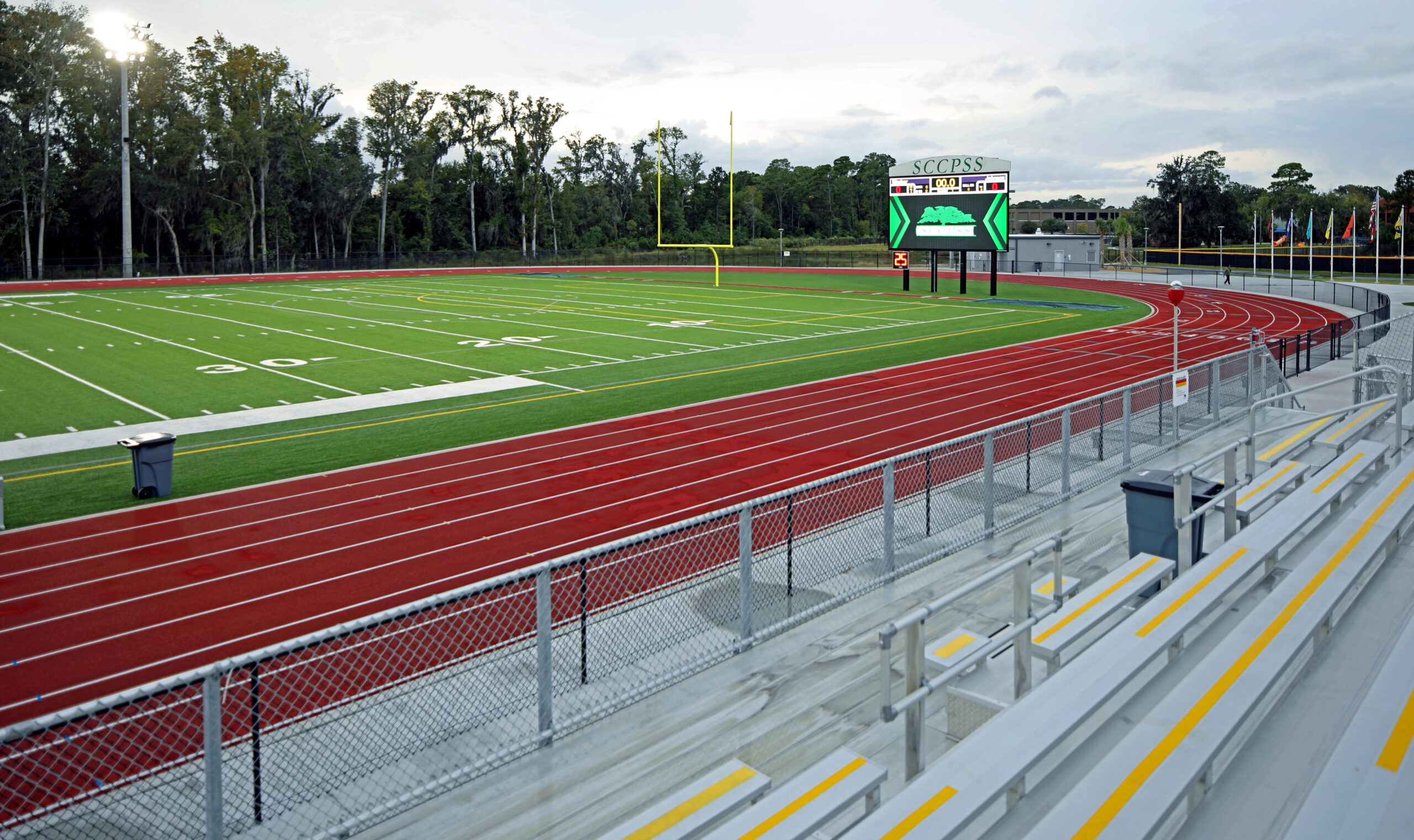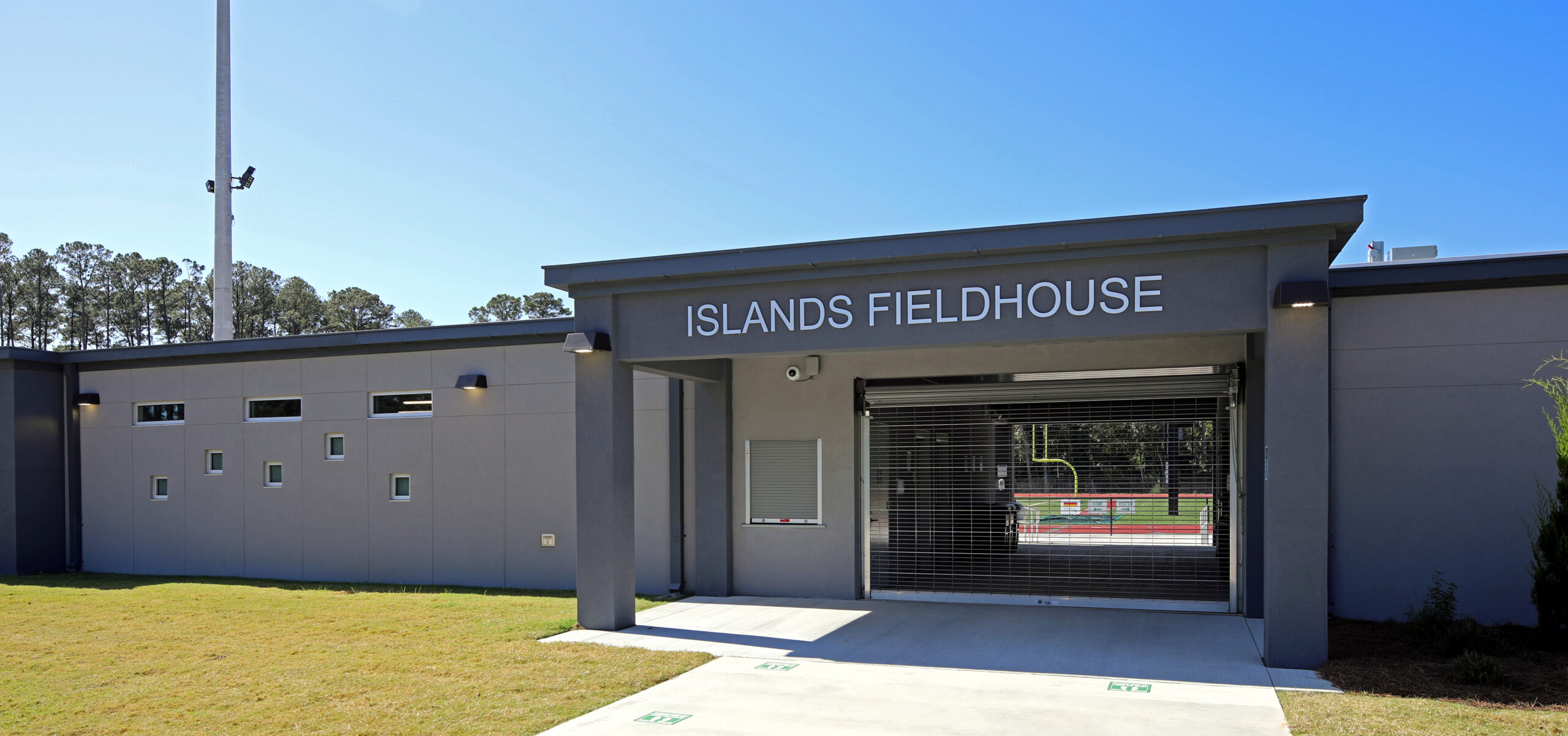 The Islands Athletic Complex was developed as a multi-phase project to support a growing school community with a high-performance, multipurpose field and track. Phase I included seating for 2,000 and two support buildings housing team rooms, restrooms, and concessions. Phase II expanded capacity to 4,000 and added additional team facilities in separate buildings. The completed